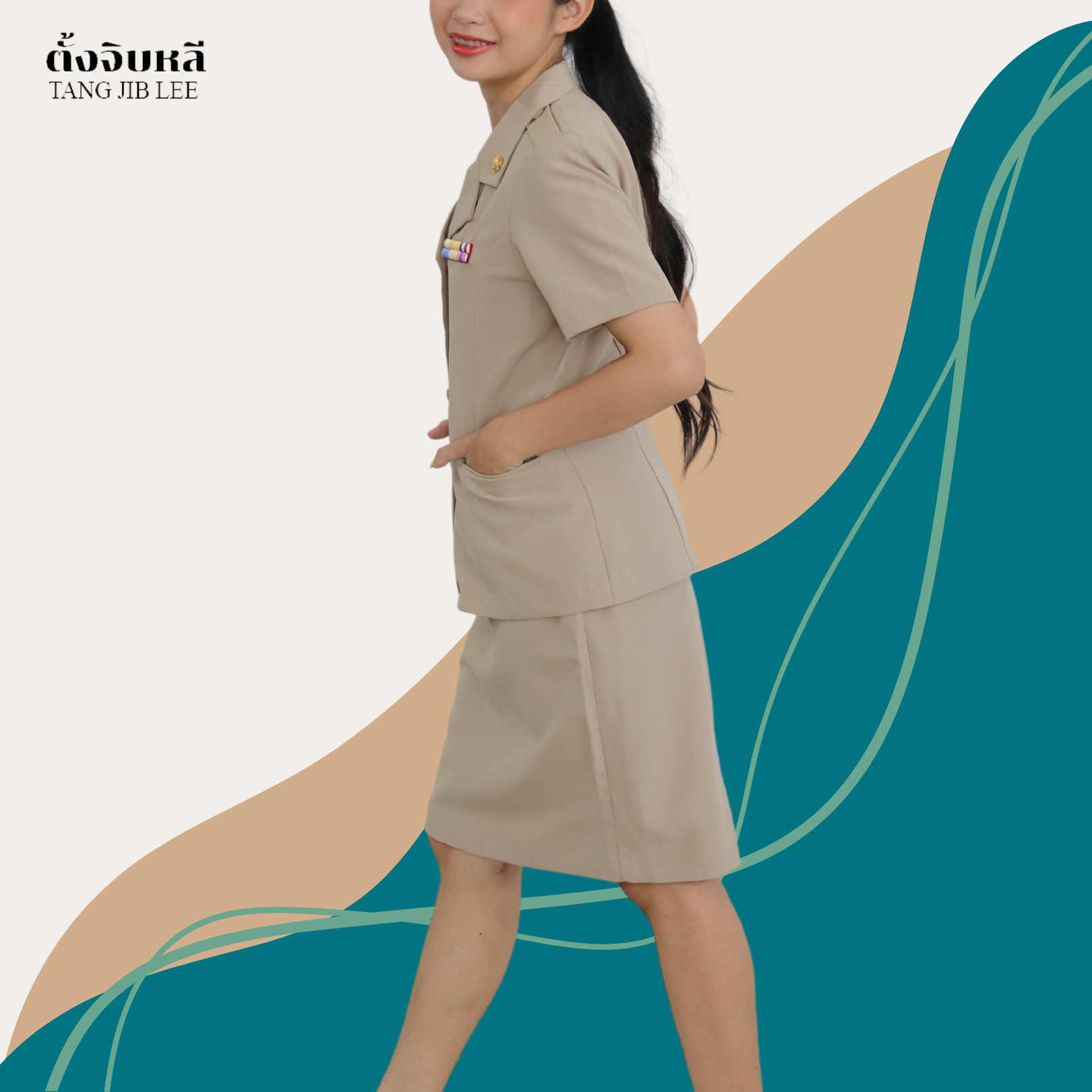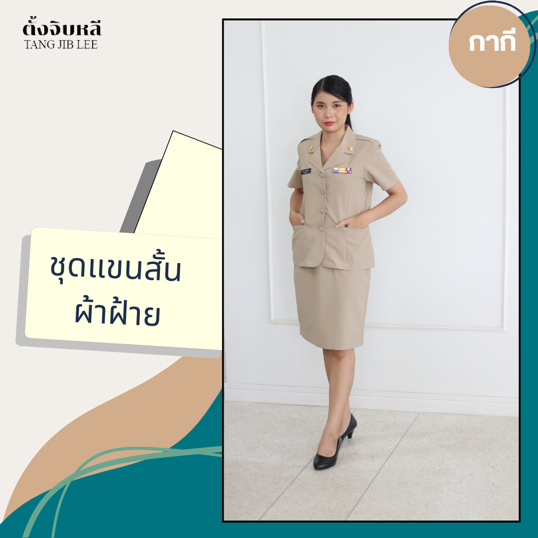 ลชุดข้าราชการกากีผ้าฝ้ายทรงซาฟารีแขนสั้นหญิง