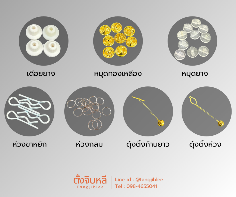 รูปแบบ | ตุ้งติ๊งก้านยาว (1ตัว), ตุ้งติ้งแบบห่วง (1ตัว), หมุดทอง (8ตัว), หมุดยาง (10ตัว), ห่วงขาหยัก (5ตัว), ห่วงวงกลม (15ตัว), เดือยยาง (6ตัว) |