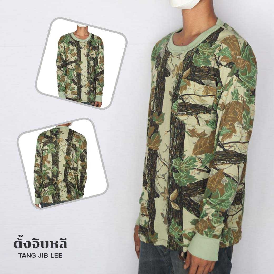 เสื้อยืดลายพรางต้นไม้สีเขียวอ่อน คอกลม เเขนยาว