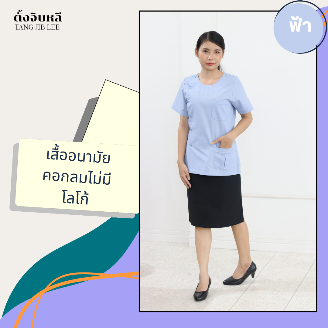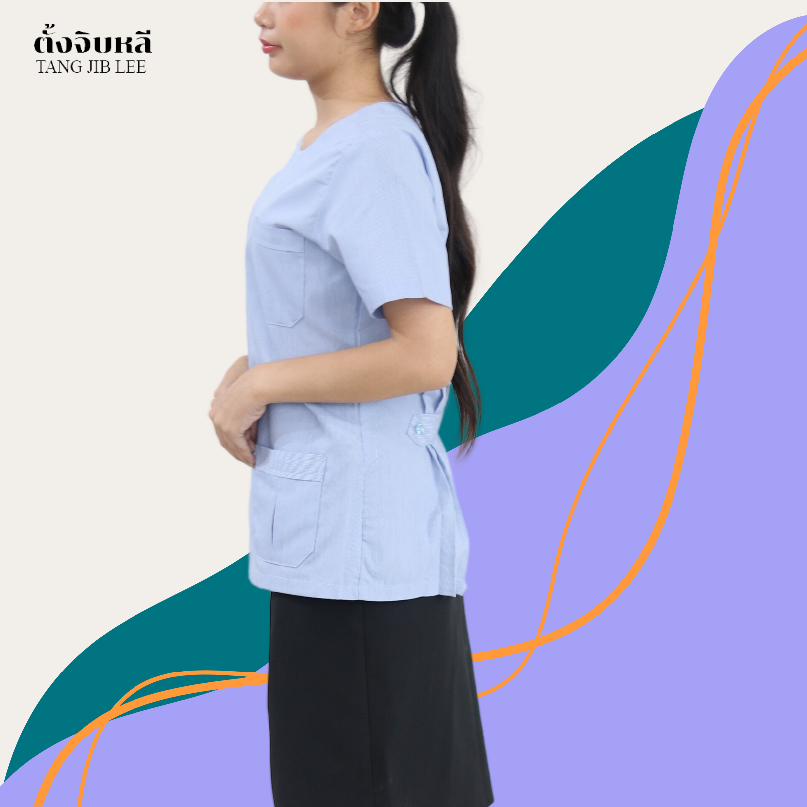 เสื้ออนามัย ลายริ้ว สีฟ้า คอกลม