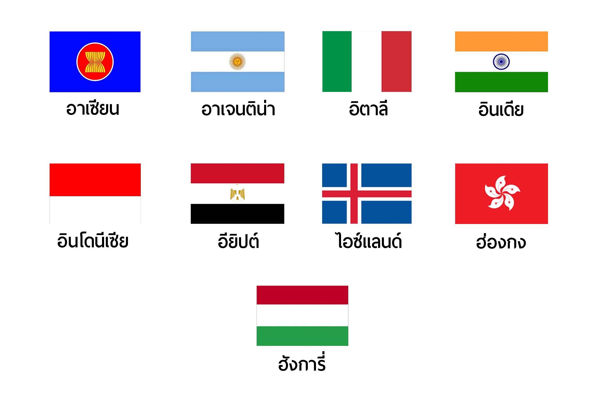 อาเซียน, อาเจนติน่า, อิตาลี, อินเดีย, อินโดนีเซีย, อียิปต์, ไอซ์แลนด์, ฮ่องกง, ฮังการี่